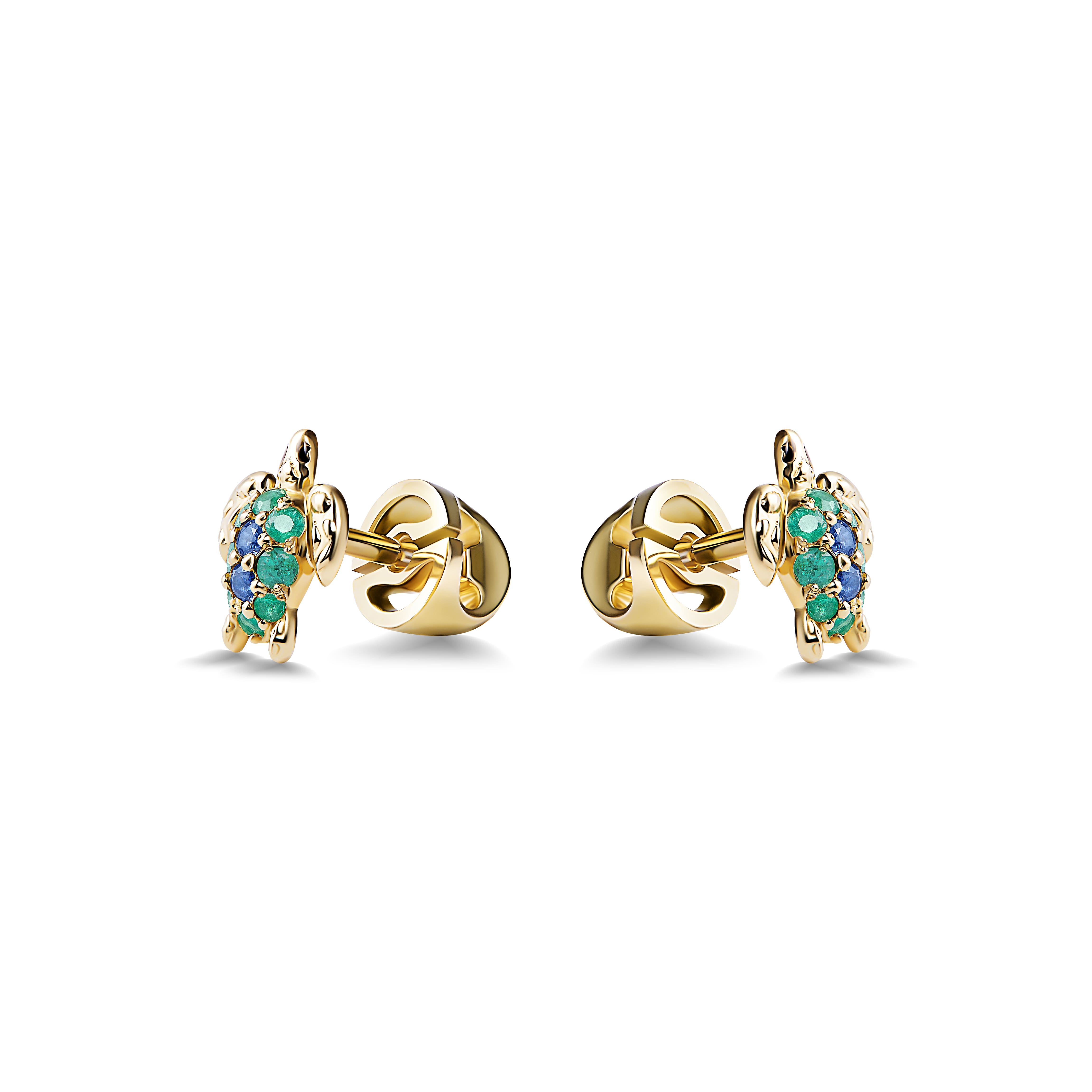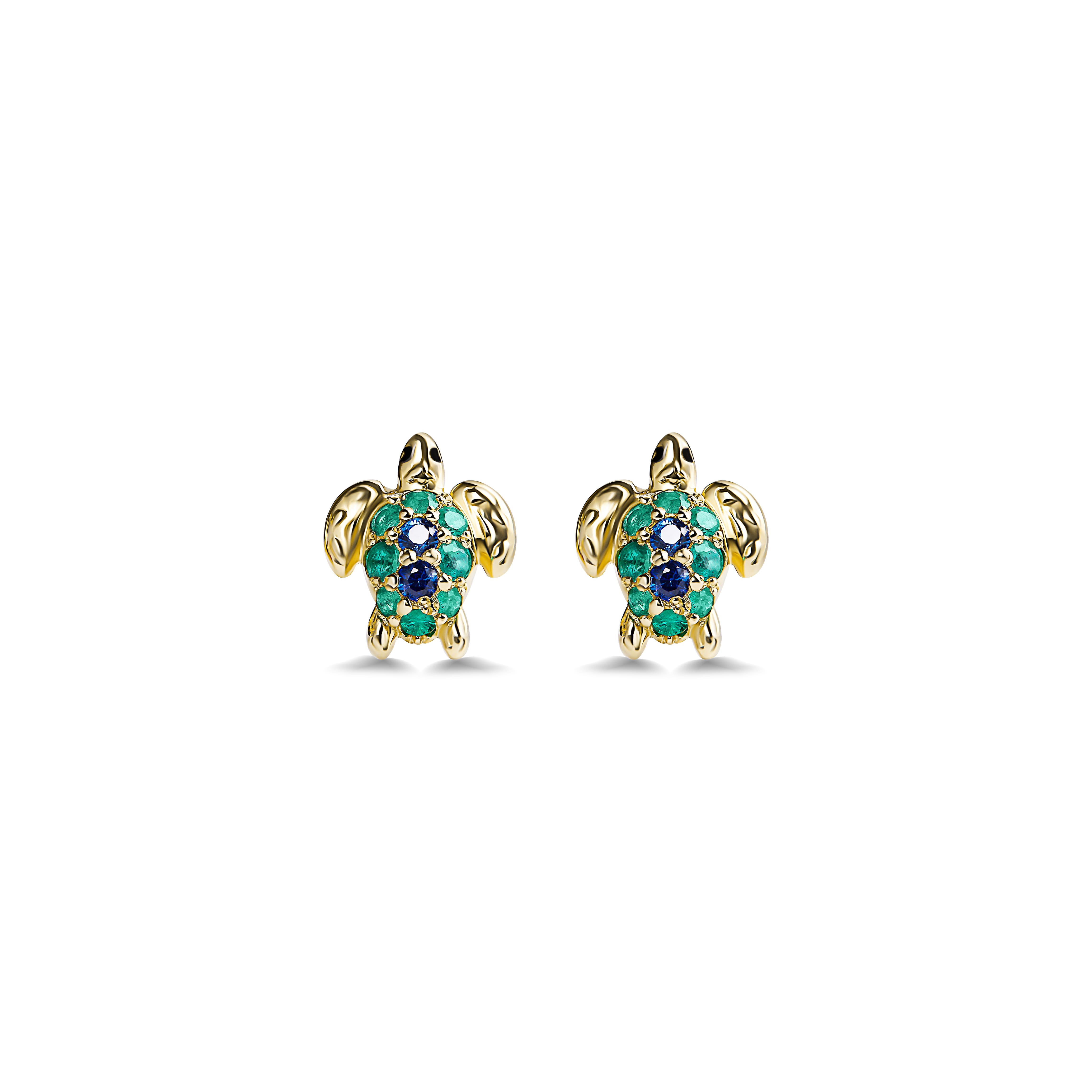 Золотое украшение с черепашками и зеленым паве выглядит ярко, необычно и живо. Такой детский ювелирный подарок подойдет тем, кто любит природу, море и украшения с мягким сказочным настроением. Золото 585 пр., 1.4 гр., изумруды 0.12Ct, синие сапфиры 0.06Ct